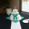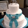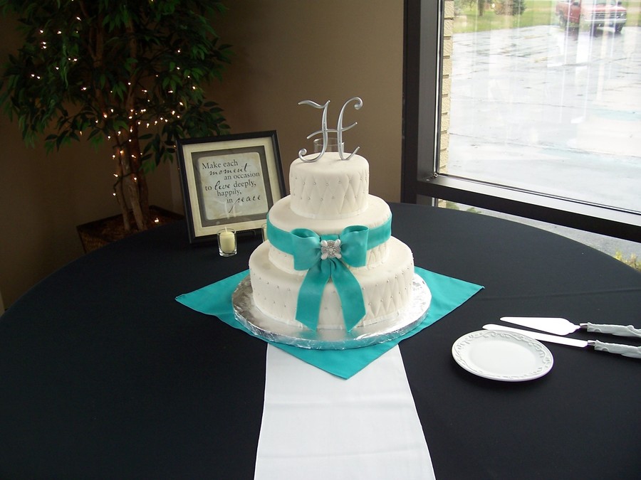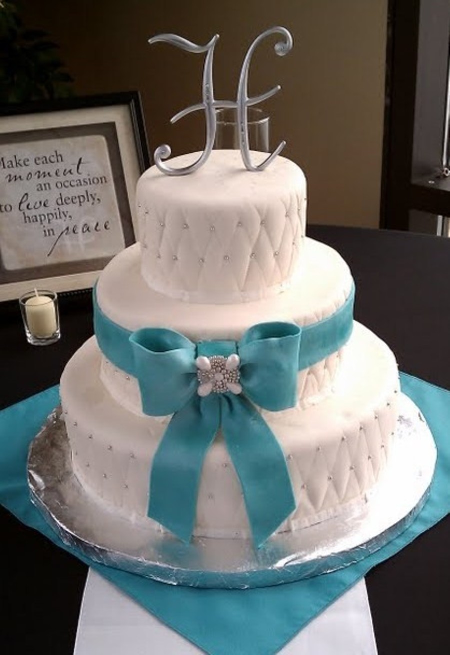 Quilted 6, 10, and 14" round with silver dragees. Gumpaste bow and edible brooch.