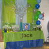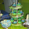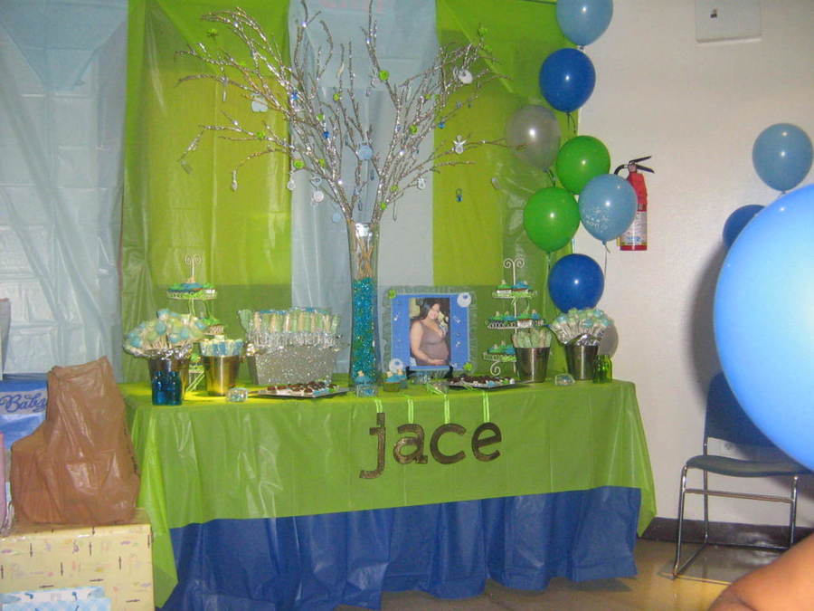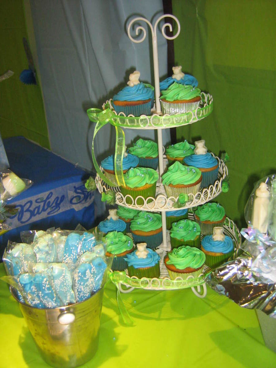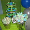 Here is a dessert table decorated for a baby shower. Table consists of chocolate lollipop favors, chocolate covered marshmallow and pretzels, cake balls and cupcakes