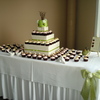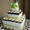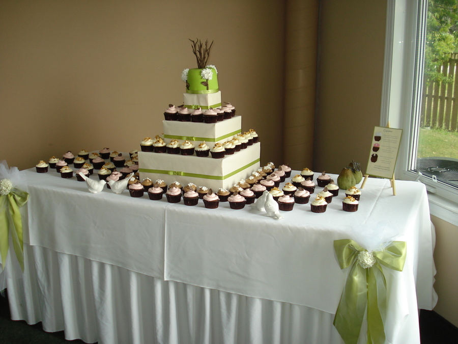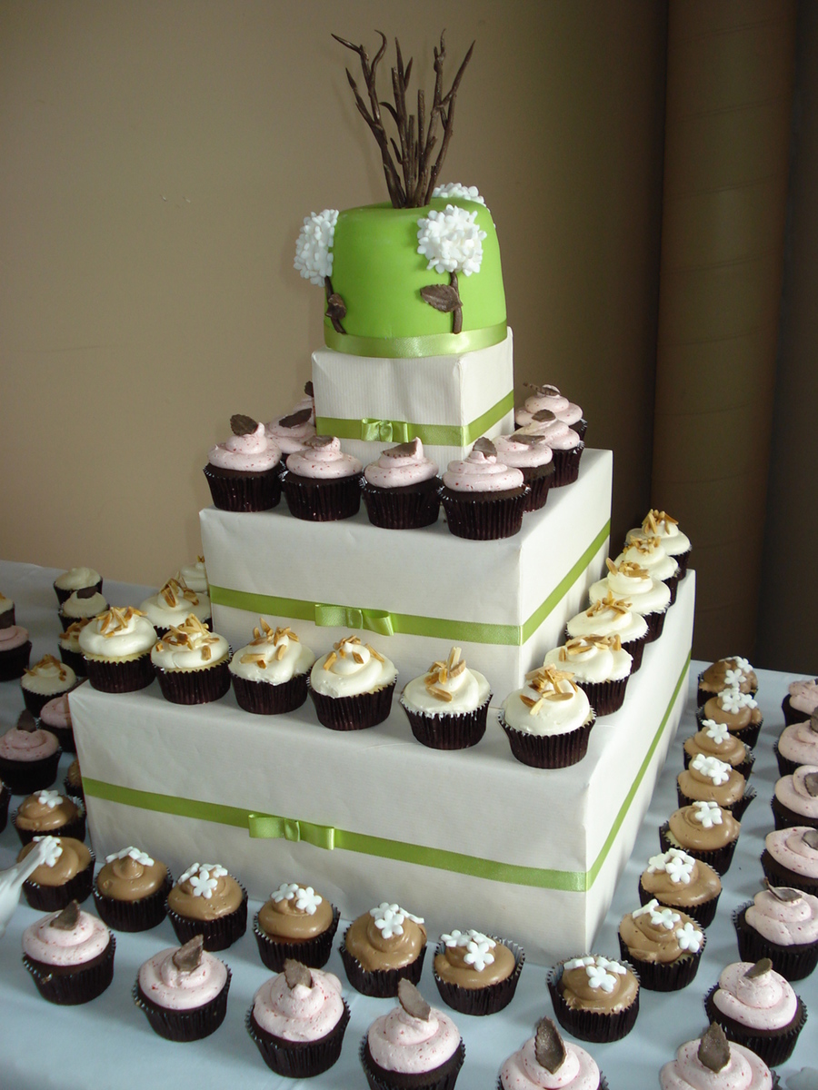 99 cupcakes in brown metallic wrappers. Small 5' cake on top which is made to match the centerpieces made with tall branches and fresh hydrangeas. Boxes covered of wrapping paper and satin ribbon.