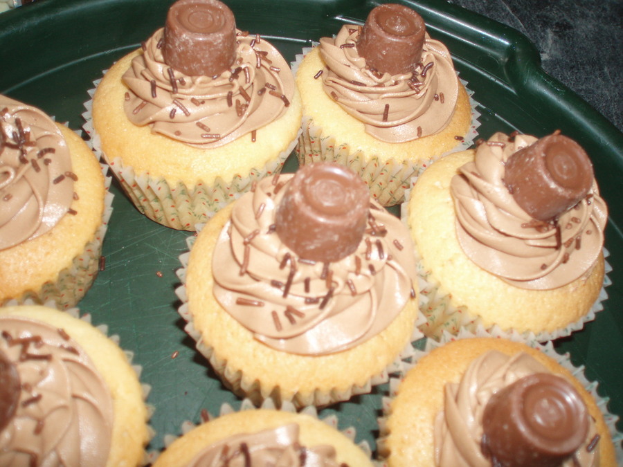 vanilla cupcake with a rolo baked into the centre topped with caramel and chocolate and caramel butter icing and and another rolo