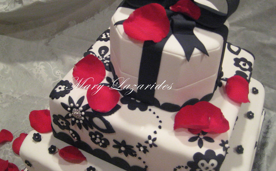 This was my first tiered cake I made over a year and a half ago. The couple wanted to incorporate the ringbox and the color scheme was black and white. I was so proud of my first "carved" cake.