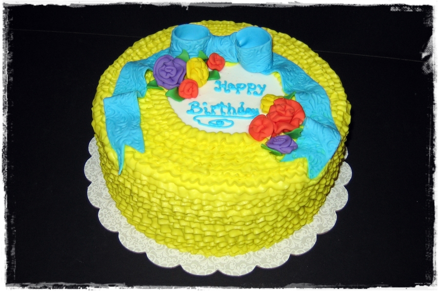 Free cake for gift certificate from a local charity auction. She just said to make it bright and pretty! I thought it was a little bright, but she LOVED it! Butterscotch spice cake with cheesecake buttercream.