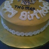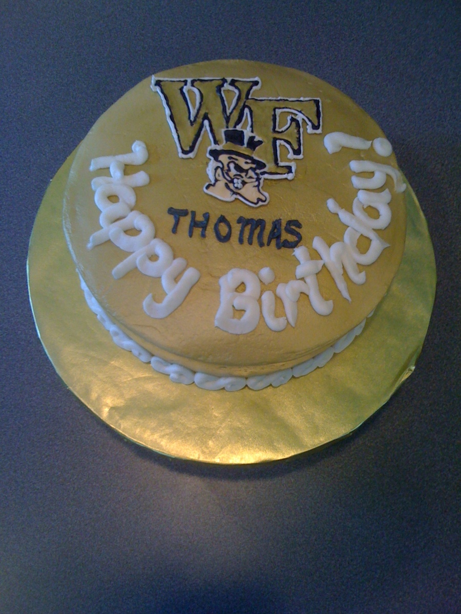 Buttercream cake airbrushed gold with color flow decal and buttercream details.