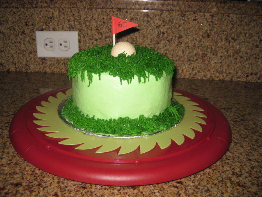 Dark Chocolate 6" two layer cake filled with buttercream and coconut frosted in buttercream. Golf ball is from a candy mold, wilton tip #233 was used. Super Easy and Fun to make. I only needed a small cake so I could not do much more with it for my Husbands BDay!