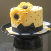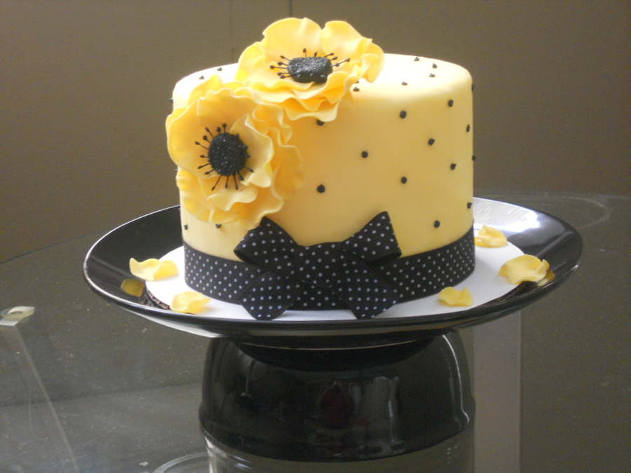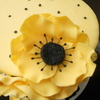 yellow fondant with black royal icing dots and 2 sugar anemone flowers