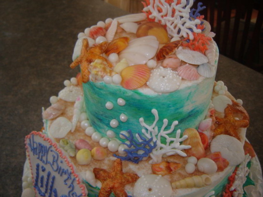 Buttercream frosting in shades of blue/green applied with a spatula to the cake and smoothed. Fondant decorations.