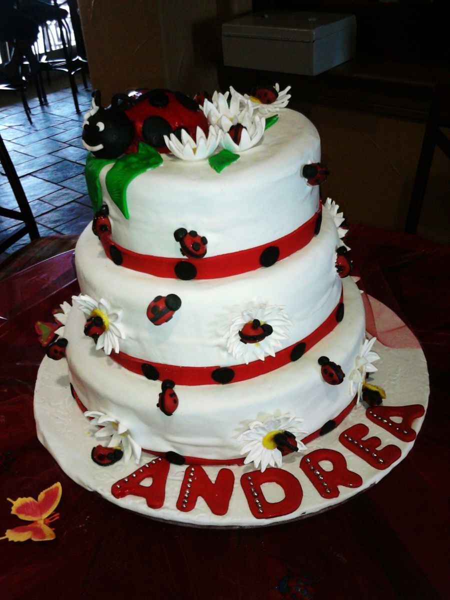 3 tier lady bug cake. 1st tier chocolate, middle margartia (no alchohol), bottome WASC with princess emulsion extract. covered in Rhondas ultimate fondant decor made of gumpaste. kinda of upset though, i messed up and made my stacking tubes too short and so my cake caved in a bit and caused my fondant to bubble... ..