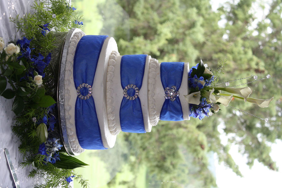 I was so happy how this cake turned out, I used the ribbon to match the bridemaids dresses and added the bling with the broaches, then added extra bling in the cake topper. I used cala lillies small roses and green. Cake is three different flavors. This was the brides cake I also did 20 other small cakes to be set on tables and decorated like the main cake she used these smaller cakes as her table decorations.