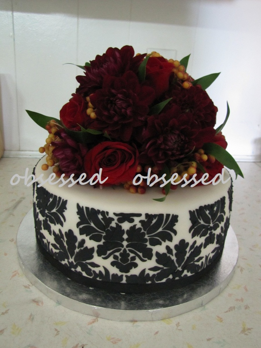 Made this one for an 80th birthday. My first crack at stencilling...have played around with them a little but have not done an "official" cake before. Flowers were not what I asked for (I showed the florist a photo and this looks nothing like it!) but the birthday girl liked it and I was generally happy with the end result.
