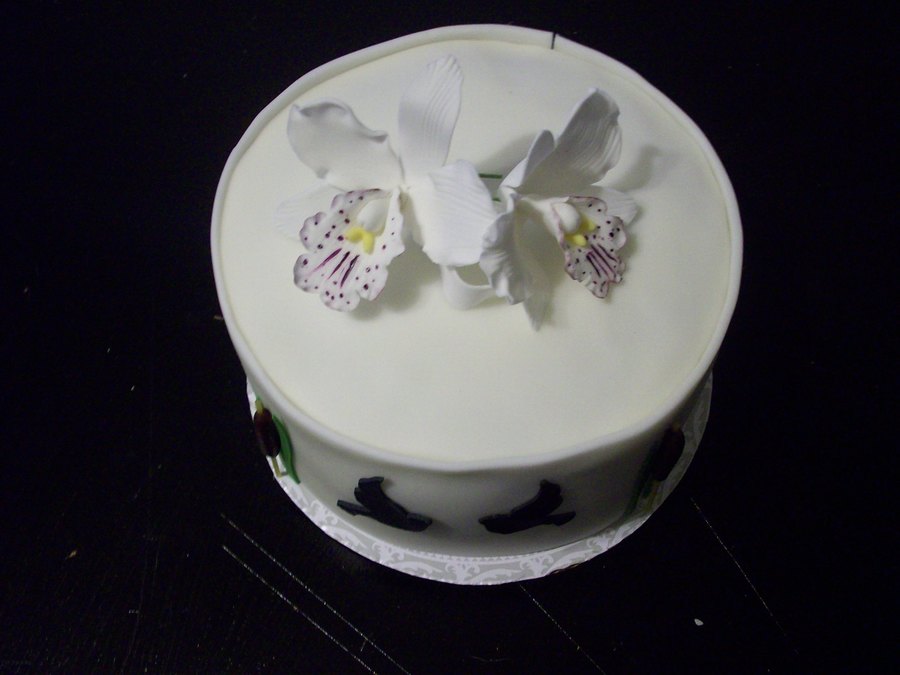 Nature inspired wedding cake. All items made off fondant/gumpaste/modeling chocolate. Cattails are from spaghetti noodles. Topper completely inspired by fellow Cake Central member!
