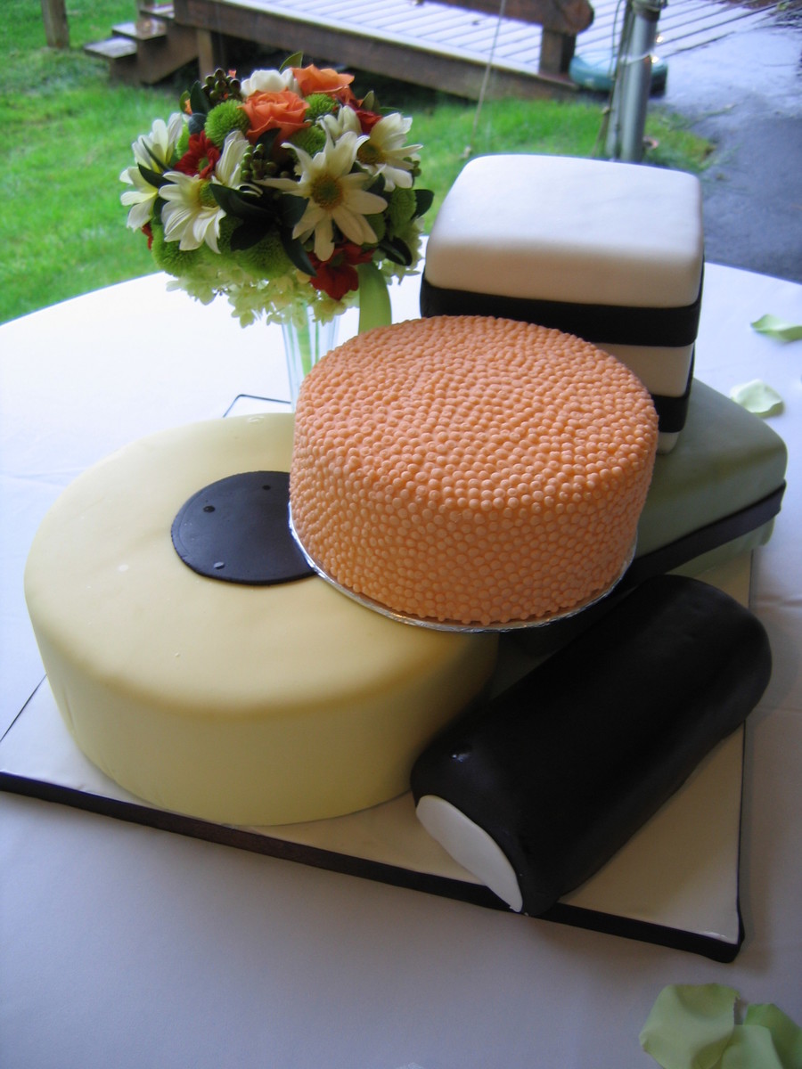 The bride and groom wanted an original cake. I asked what kind of things they loved and their response was candy! Their favorite is allsorts, so I made them in their colours.