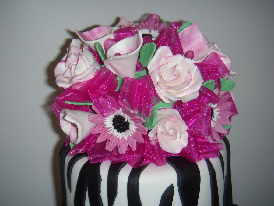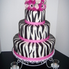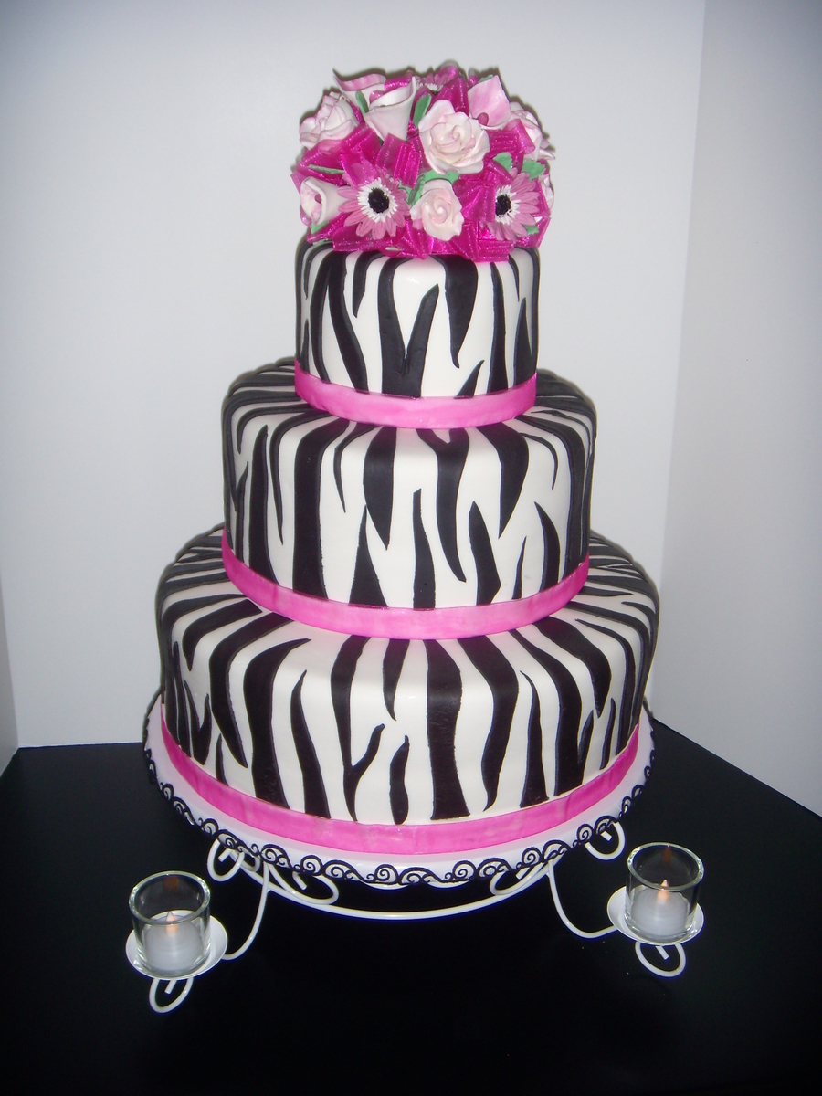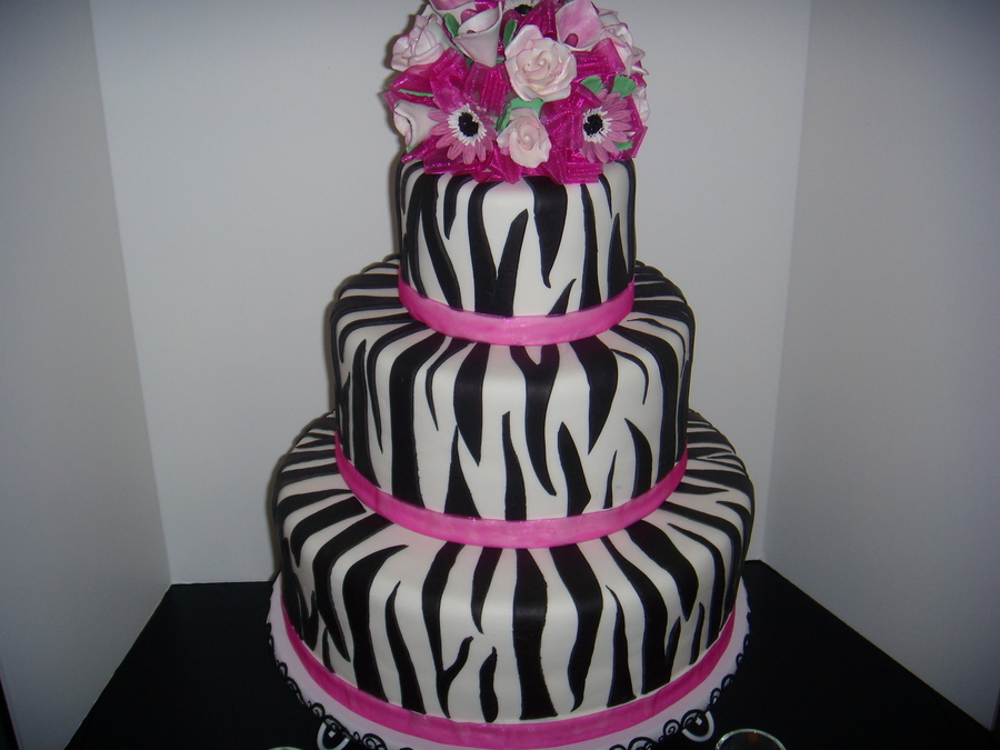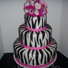 3 tier round cake, vanilla, chocolate, & marble tiers covered in fondant with black zebra stripe pattern and fuschia ribbon. Gumpaste flower topper. Thank you to jamilyn for allowing me to reproduce her cake.