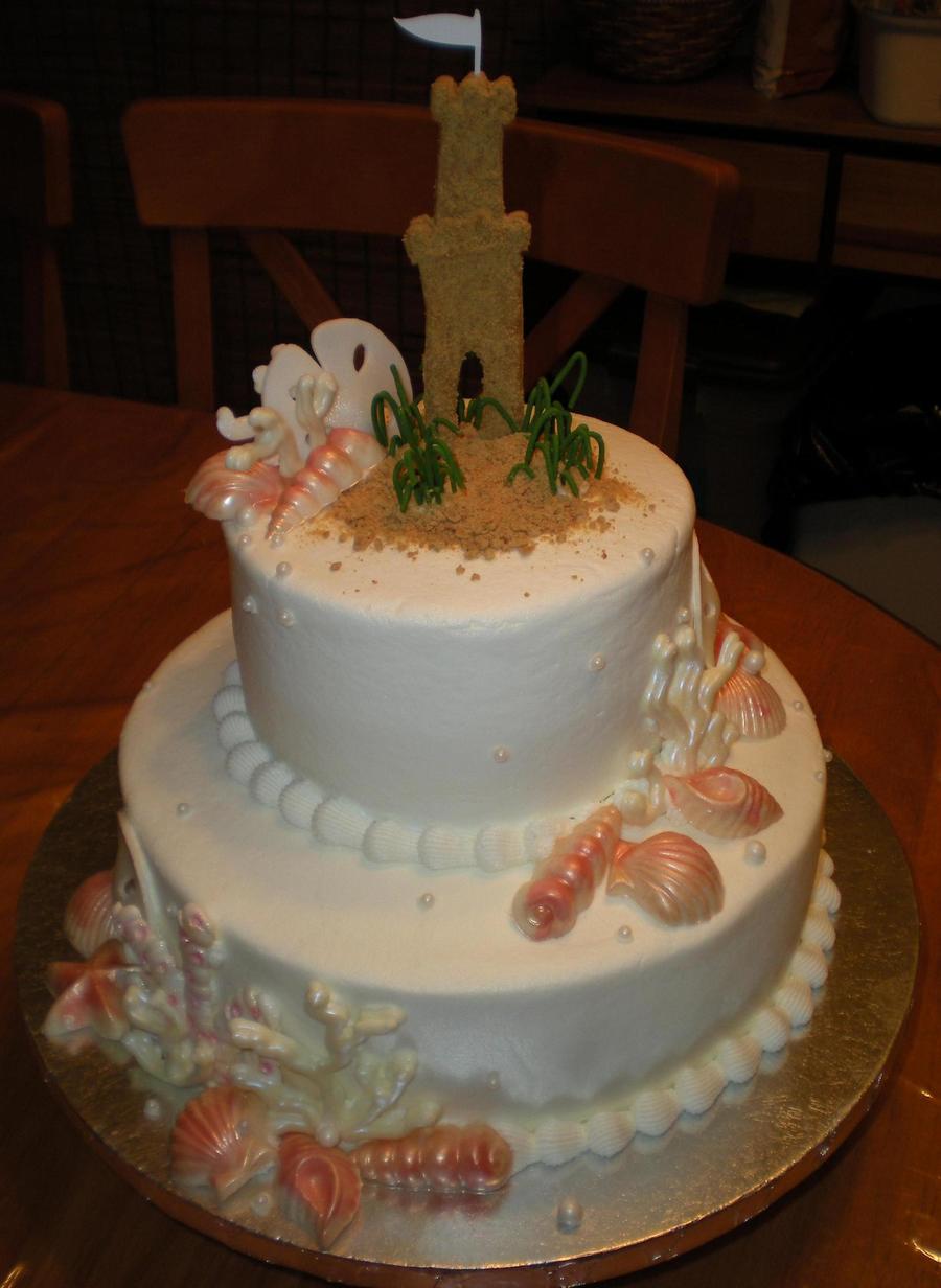 Fondant sand castle. All shells are chocolate, with chocolate coral. Cake is iced in BC.