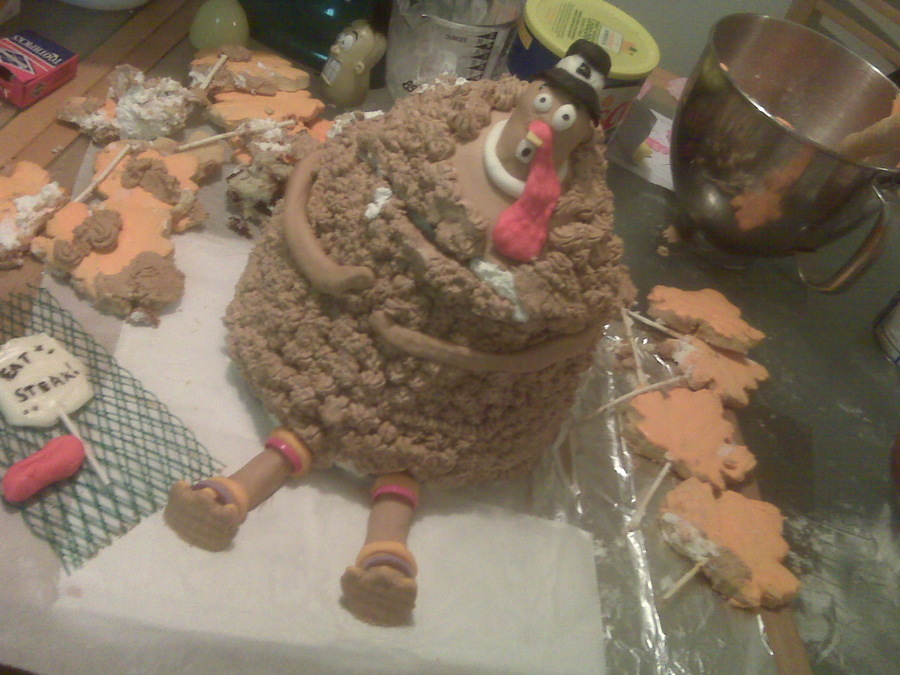 First cake on my own. I used a regular cake mix out of a box and tried to use sugar cookies as feathers. Good thing I know better now....salvaged the cake by using fondant to hold it together. Whew!!!!!!!!!! Won the turkey contest at work anyway :))