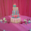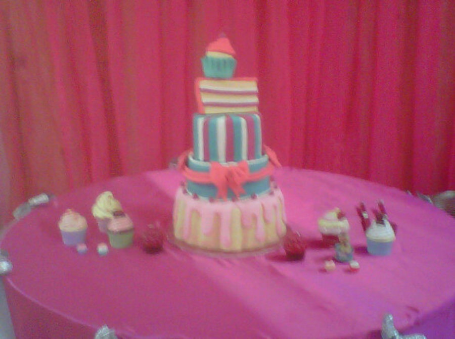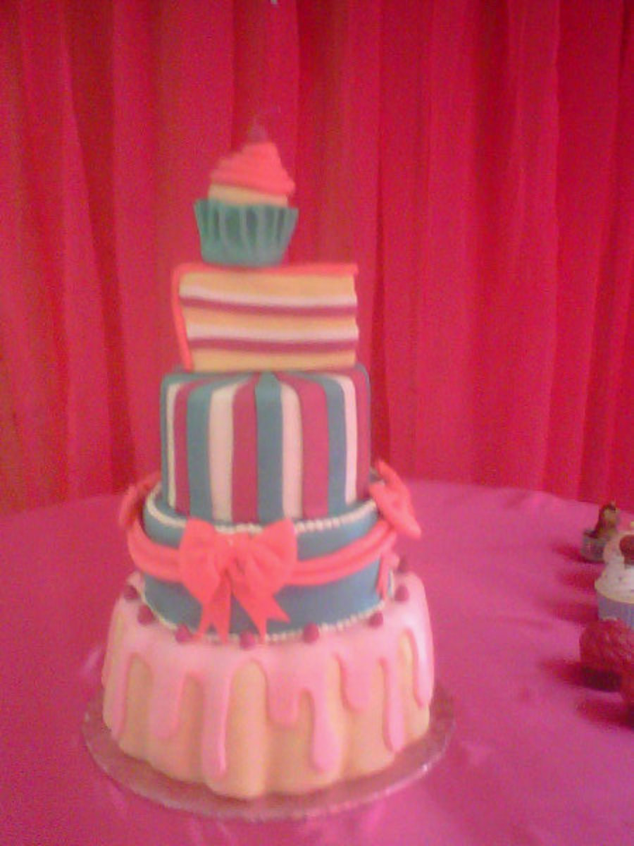 This is a wedding cake I made. I used 15 pounds of fondant to cover it and it had to be assembled on-site. The bottom tier is hand carved to look like a bunt cake. Sorry for the poor pic quality. Working on getting a better camera.