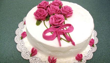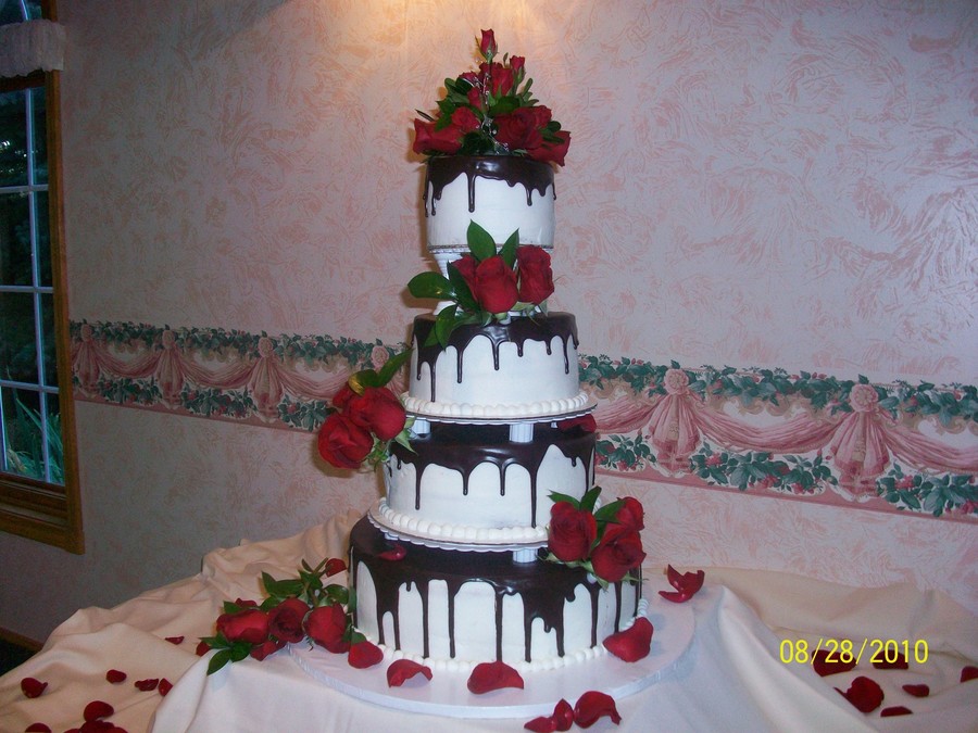The cake was traditional white cake with white buttercream -topped by untraditional chocolate ganache. Roses were real.