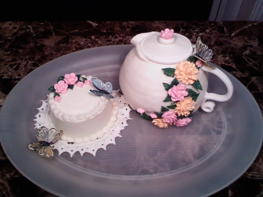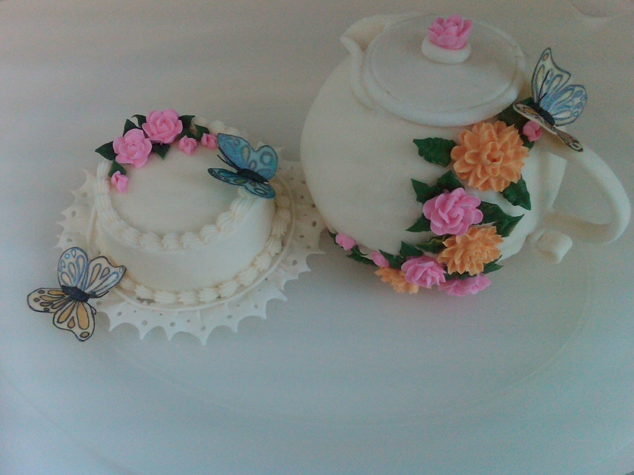 Teapot covered with MMF decorated with royal icing flowers - MMF doily and mini cake decorated with buttercream and royal icing flowers. Butterflies are MMF with royal bodies and string antanae.