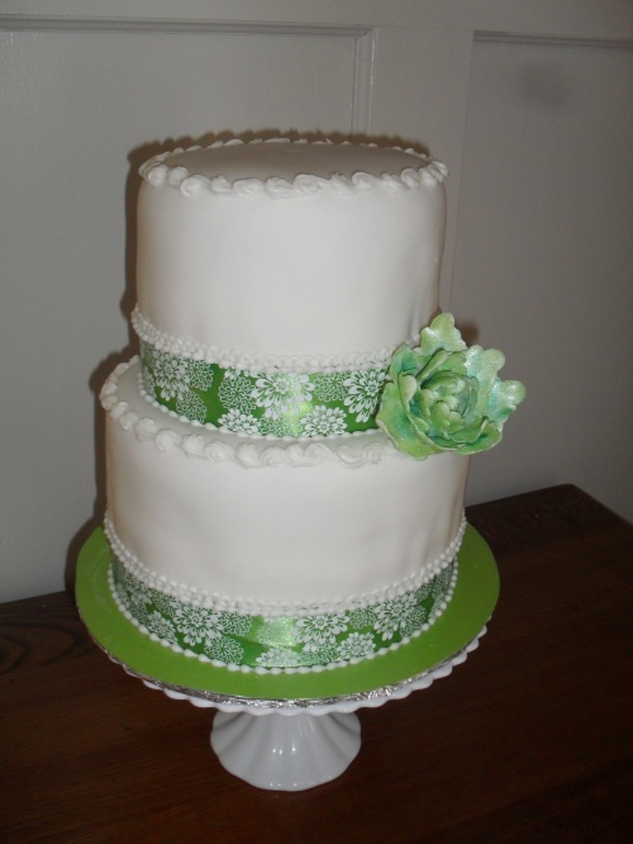 Fondant, royal icing borders, ribbon, and a green oriental peony