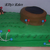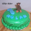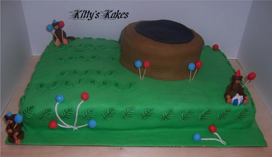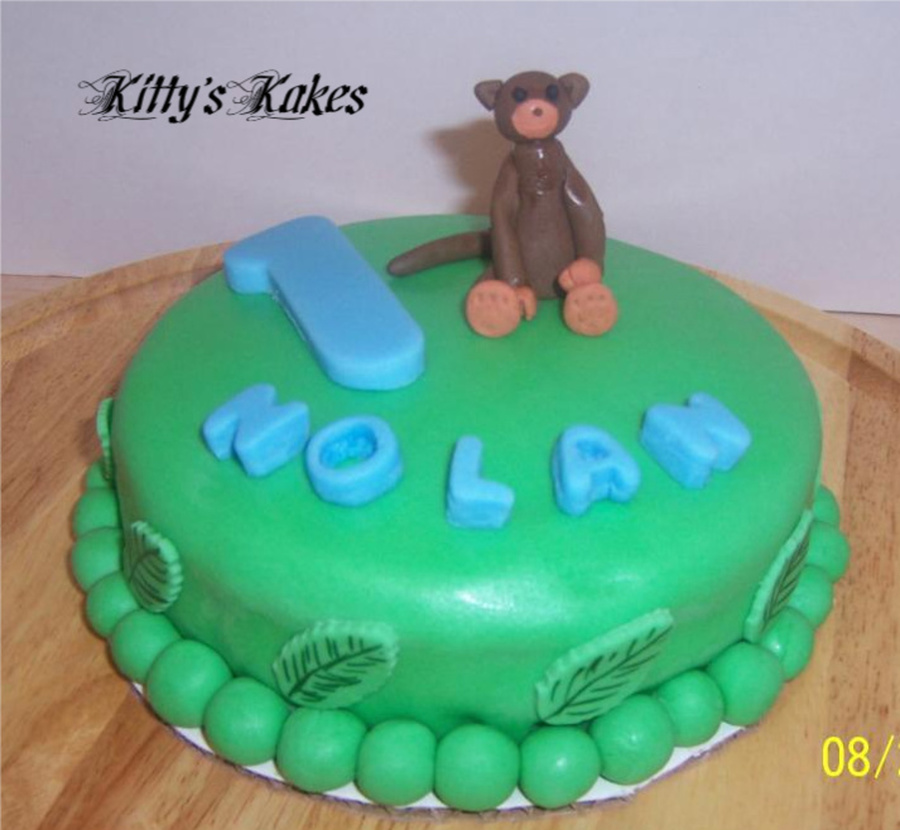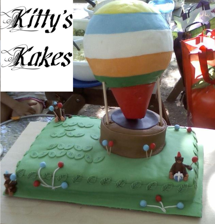 Joint bday cake for 1 yr old and 7 yr old brothers. The 1 yr old is nicknamed monkey and the 7 yr old loves hot air balloons and has been up in them 100s of times! I made the 1/2 sheet cake look like a rolling field that the balloon takes off of. This was my first cake that I needed these types of supports and had to assembly the balloon in front of about 30+ party guests...nerve racking but got it done!