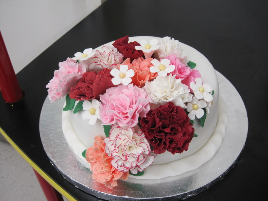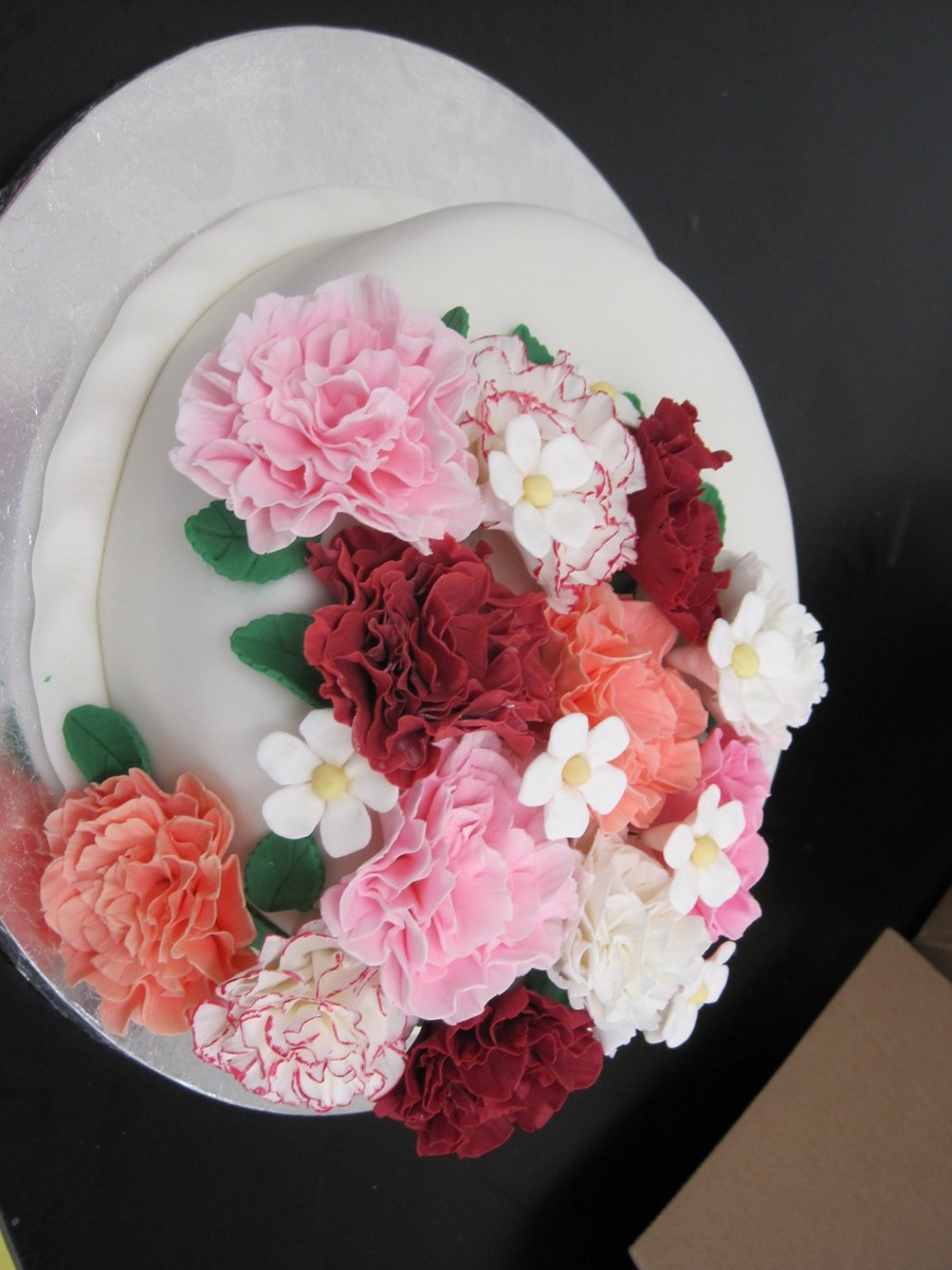 Final cake for Wilton fondant class. First time covering a cake in fondant. Flowers made using tutorials found on Cakecentral.