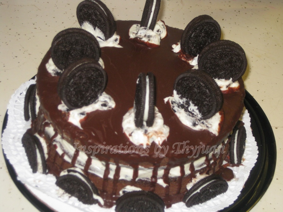 Chocolate cake with Oreo filling and chocolate ganache topping.