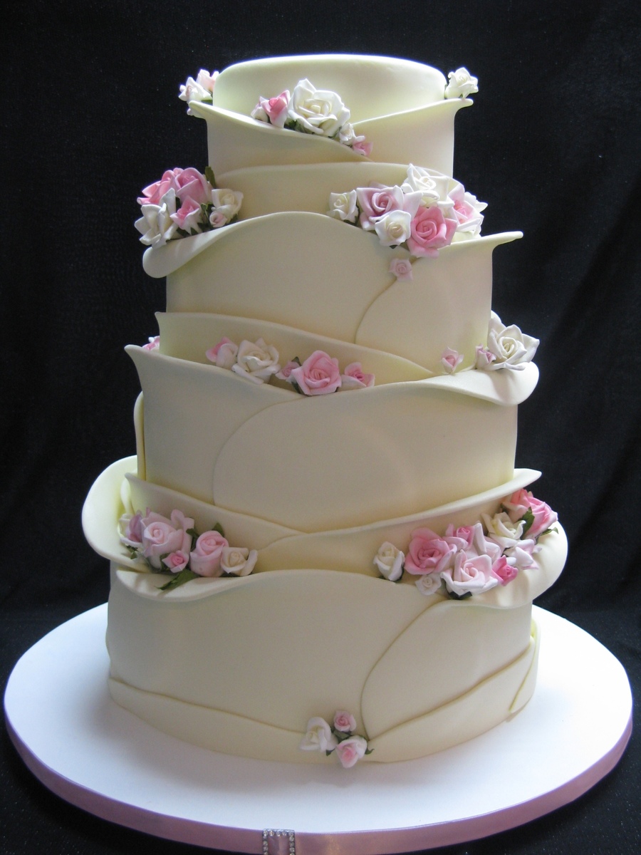 the size of that cake is 6-8-10-12 inch,i wrap the petals beginning by the 6 inch and go down no need to peel off it cuts very well, with a sharp and hot knife