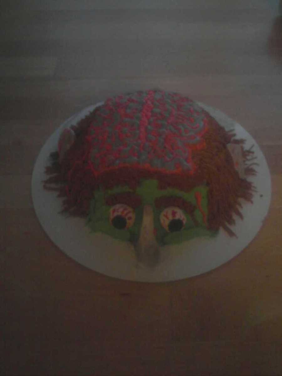 Last minute cake for Halloween party used soccer ball pan eyes ears and nose fondant