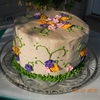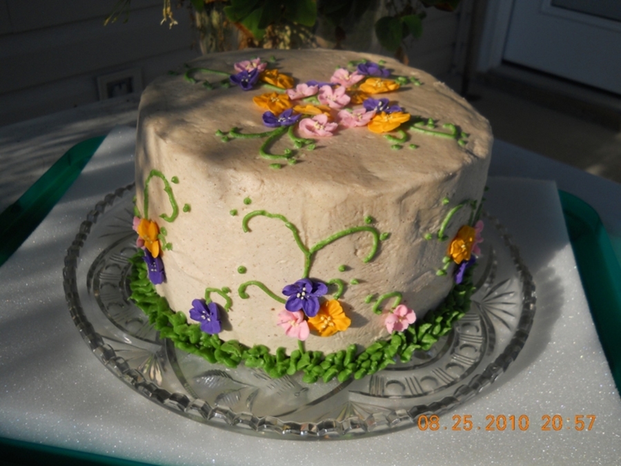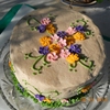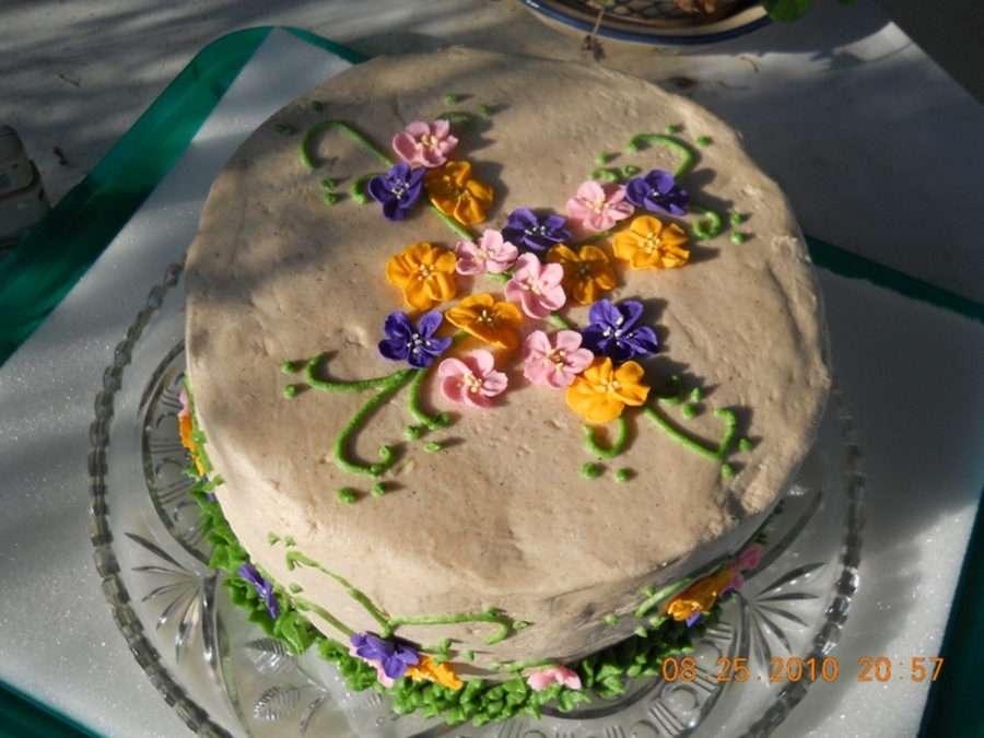 Cinnamon Bun Cake with Buttercream/cinnamon icing, Apple Blossoms in Orange, Pink and Purple