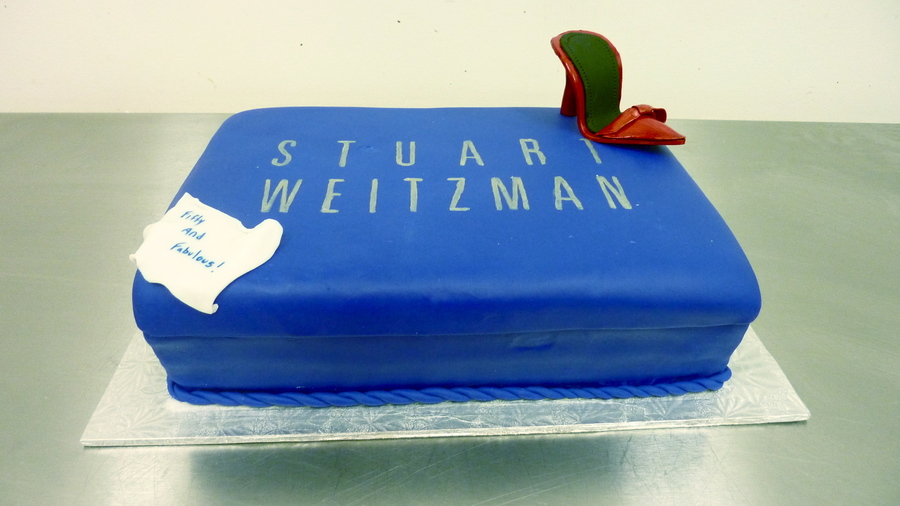 Two 9x13 red velvet cakes stacked. Covered in fondant and the teeny tiny shoe is gumpaste. I printed the logo and cut out the lettering with an exacto and used it as a template. Painted with luster/vodka. TFL!