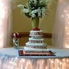 Alternating sizes of square and round shape. Polka dots made from royal icing, gum paste roses and white chocolate balls, dusted with pearl dust for the border