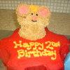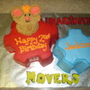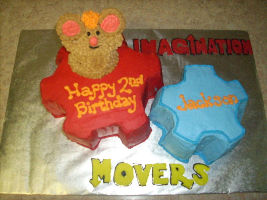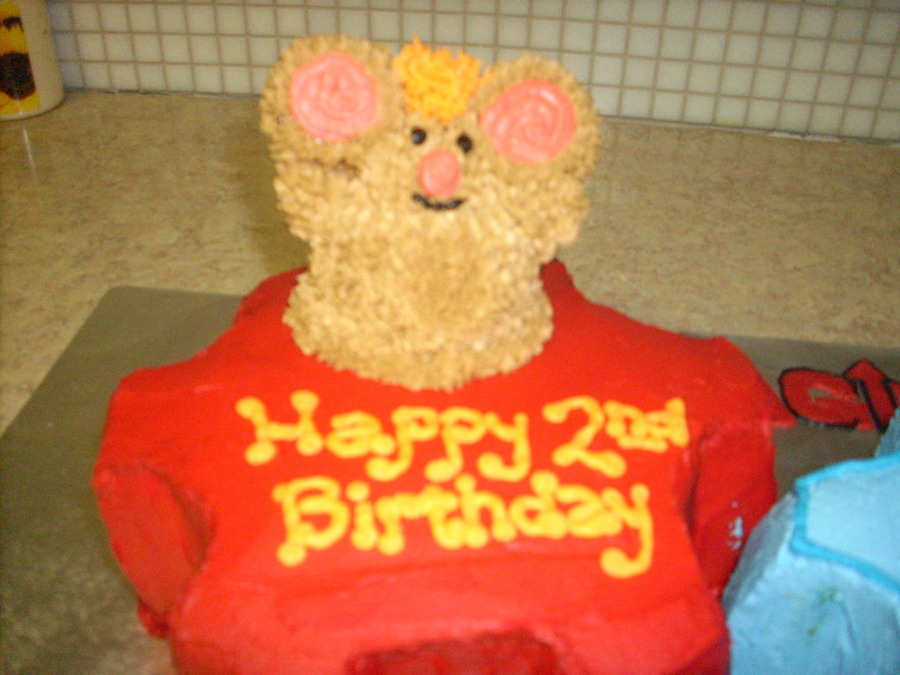 Two (2) gears with Warehouse Mouse on top, yellow cake, with strawberry filling, butter cream frosting.