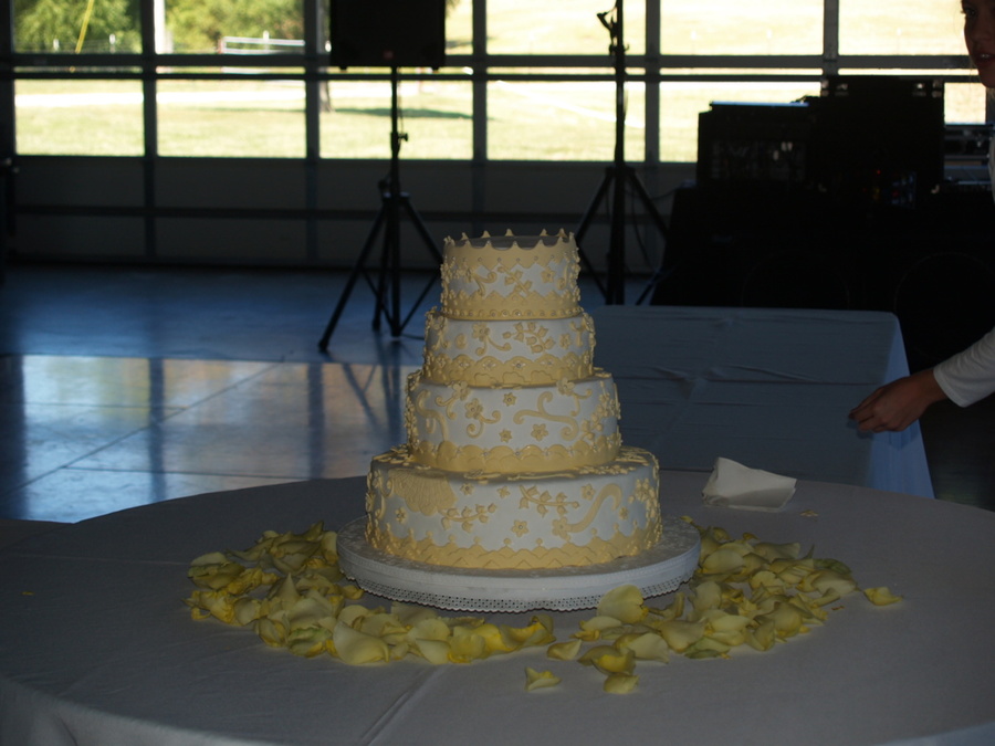 Inspired by RBI Lace Canopy cake in Martha Stewart Weddings. The inspiration cake is tone on tone but this bride wanted something a little different. Chocolate and white cake layers covered with ganache and fondant. Flower applique of gum paste.