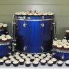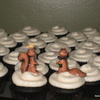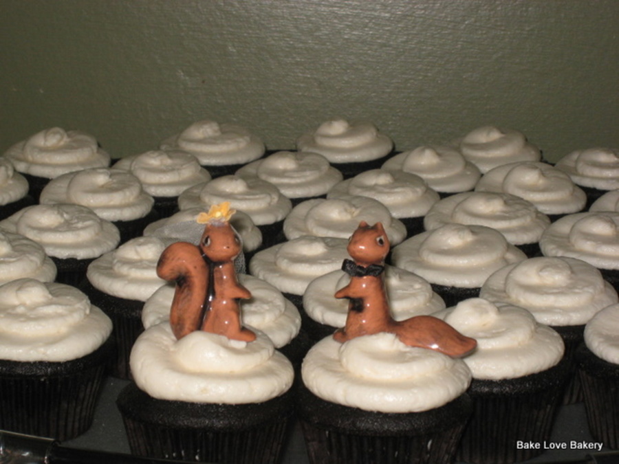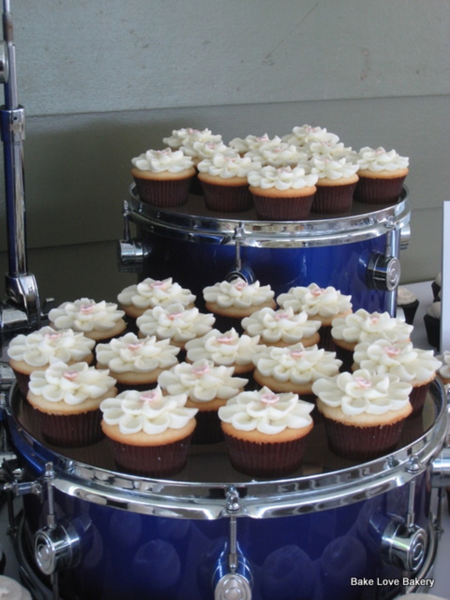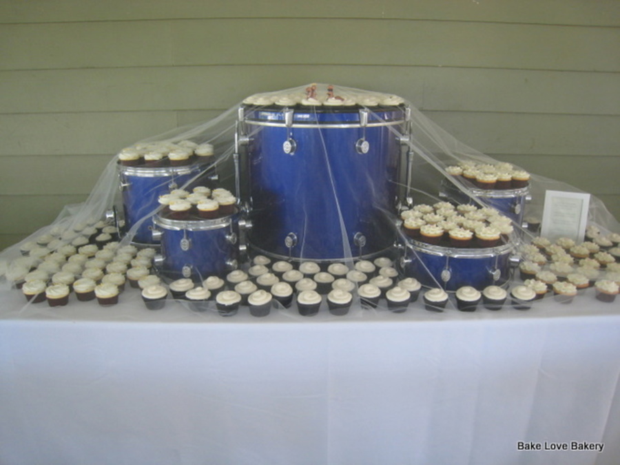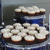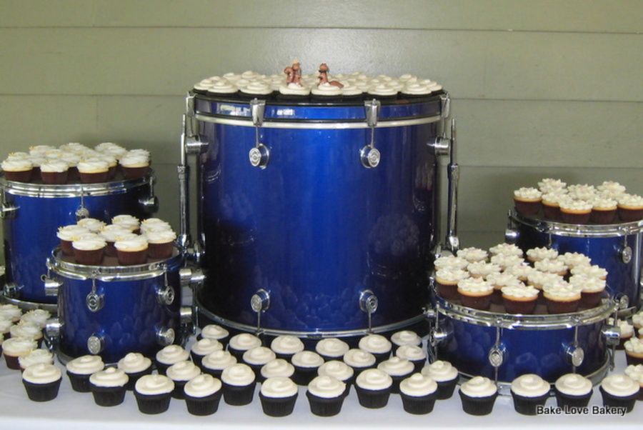 200 cupcakes for a wedding. bride/groom provided the ceramic squirrel toppers. The groom is in two bands and the cupcakes were displayed on his old set of drums.