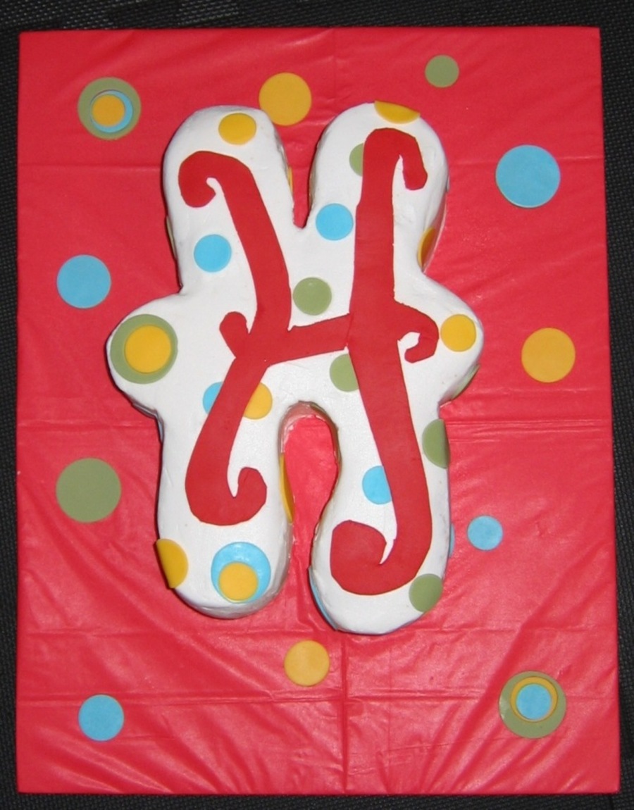 Thanks to Ncox for the idea!! I carved a 9x13 iced in buttercream. It was not easy getting between the legs of the H. Letter and dots are fondant
