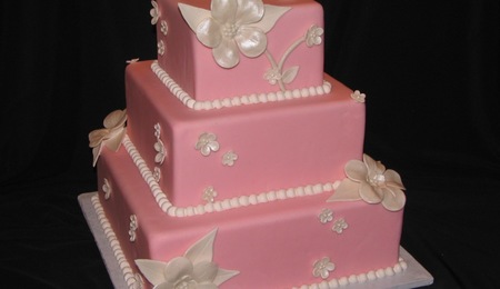 This cake was covered with black fondant and had white gumpaste stephanotis flowers; white satin ribbon. It was a chocolate fudge cake with chocolate ganache filling and vanilla buttercream under the fondant. I thought the design and flavor were both risky choices for the bride, but I think it looks quite elegant.