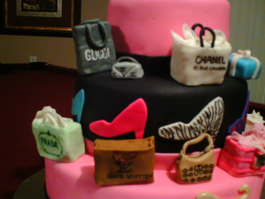 cake for a shopping diva. bags and dress form are fondant covered RKT. I had a lot of fun with this one