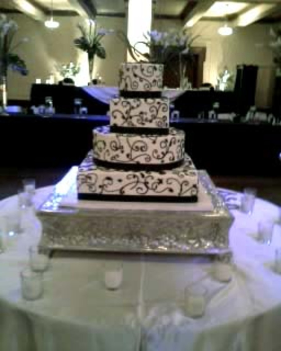 Alternating rounds and squares, free hand scrollwork/piping in black buttercream. Sizes are 5" Rnd, 7" Sq, 12" Rnd, 15" Sq. Oh, I should add that this pic was from my cell phone and the first pic is from the back due to lighting :( Thanks for looking!!!