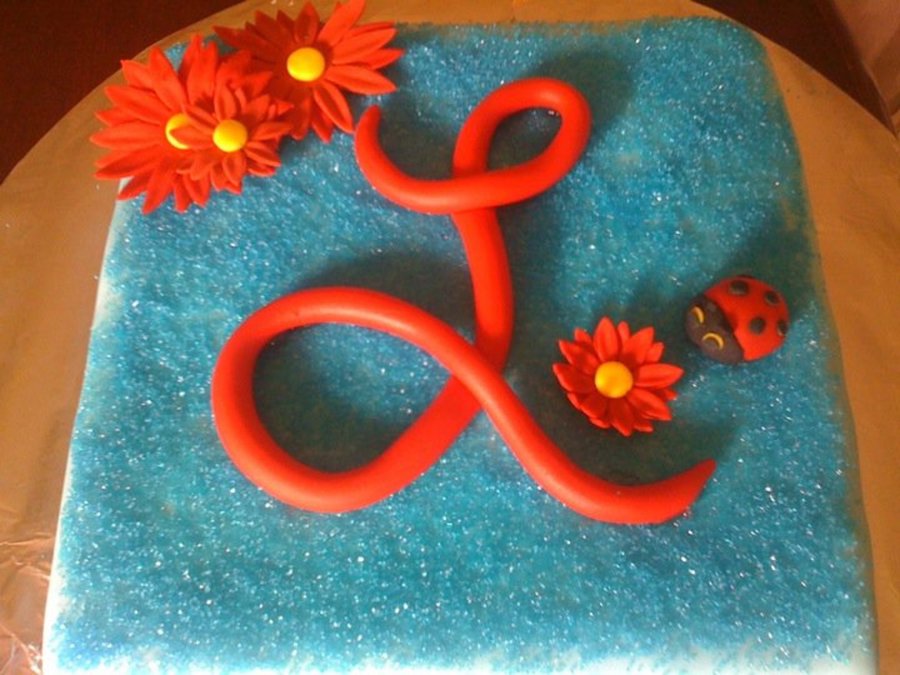 Square cake covered with fondant and sugar crystals. Decorated with fondant details.