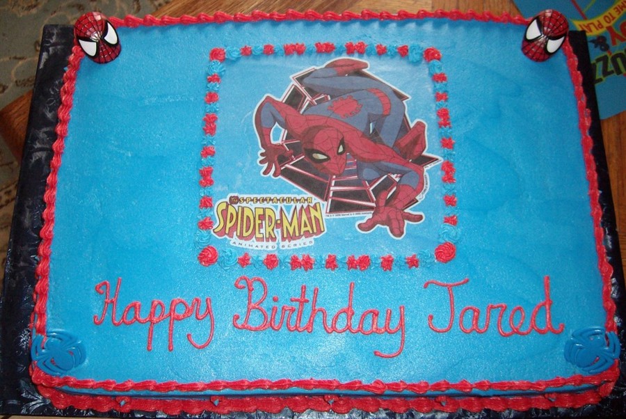 Special request from my Godson for a blue cream, white cake, Spiderman. Edible image