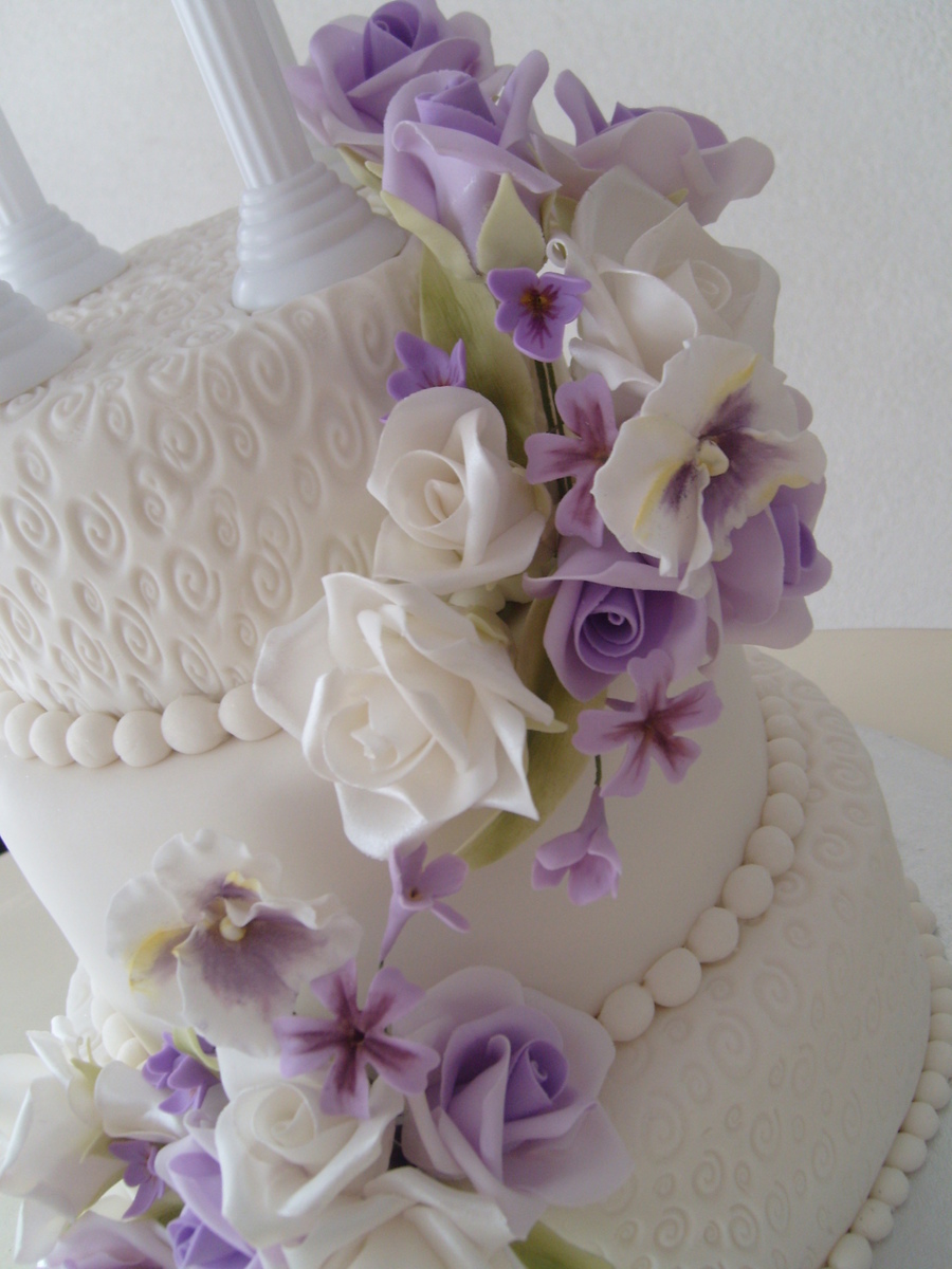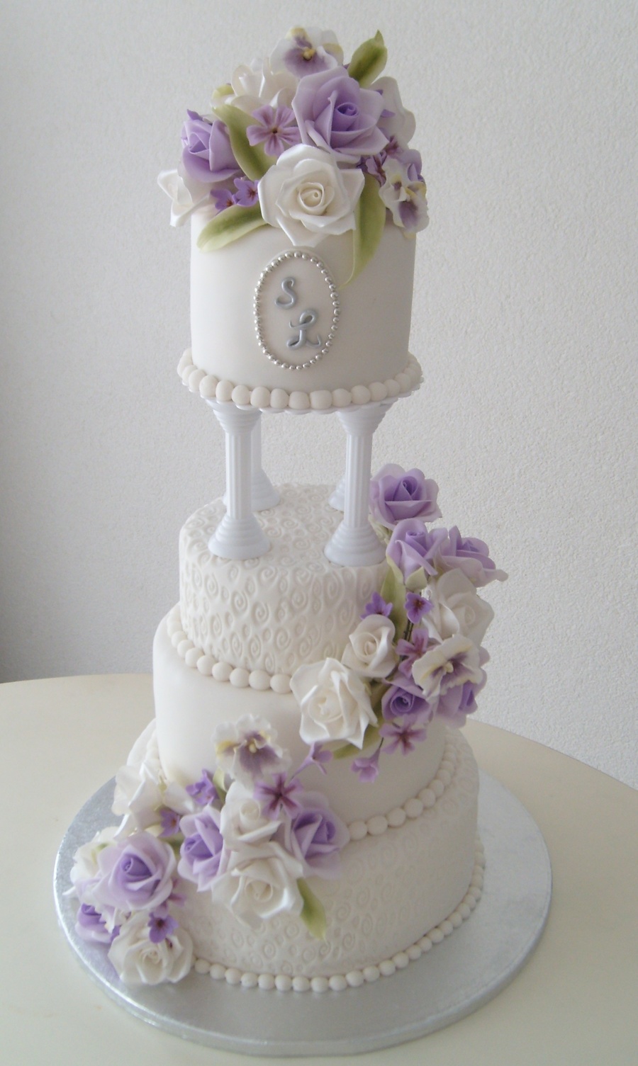 This is a cake I did in August. It is one of my favorites because of the soft colors of the gumpaste flowers. And I always love initials on a cake. Thanks for watching!