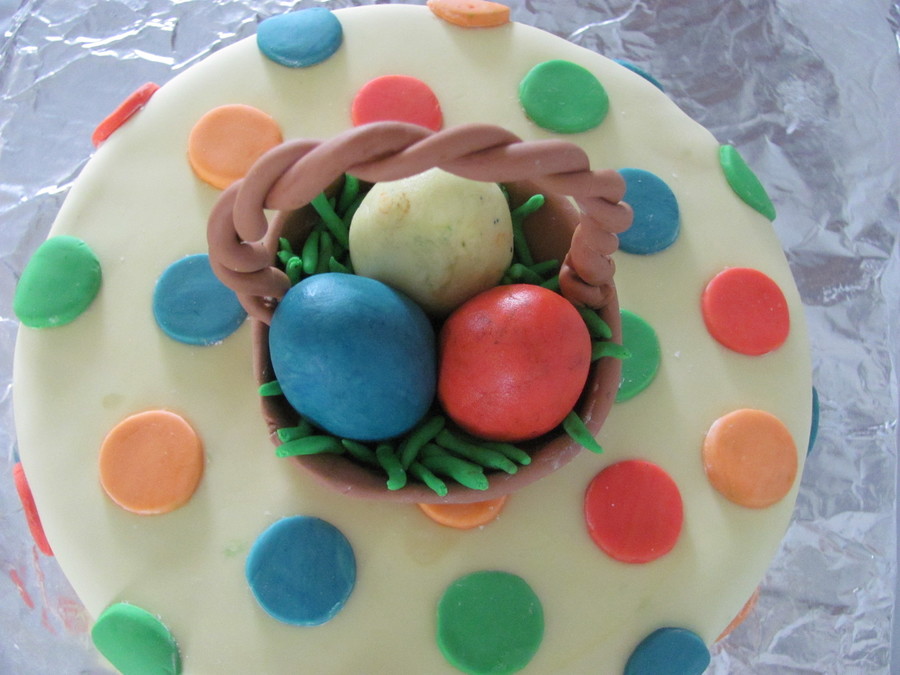 i made this cake for easter. it has eggs in a basket all made of fondant for the decoration on top