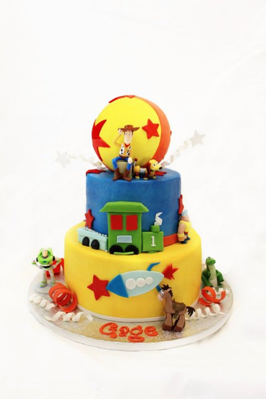 Cakes are 9 and 6 All buttercream, airbrushed. 4 inch styrofoam ball covered in fondant....cake has toys and fondant accents.