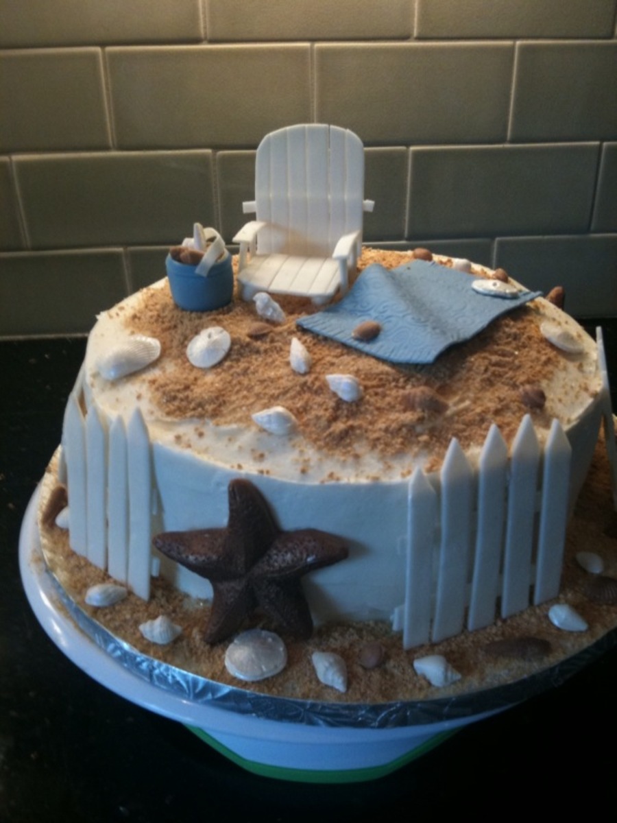 For my DH who loves the beach! Mini choc. shells, fondant beach pail, beach blanket, fences, GP chair (which gave me fits!!)
