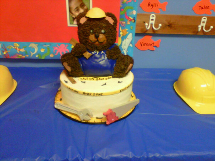 Wilton 3D teddy bear in chocolate cake, 10in round wasc. Candy tools, fondant hard hat, overalls, caution tape, and nails. I thought this was such a cute idea and theme for a baby shower, my favorite was the little nails in the front pocket.