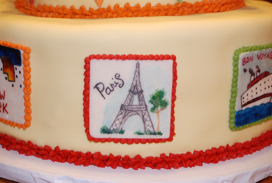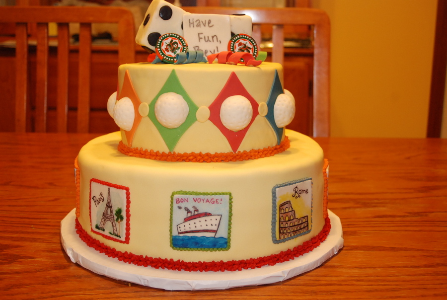 This cake is representative of the things the retiree will be doing while retired. Golf, going to the casino and traveling. My daughter painted the white chocolate squares using food coloring thinned with vodka.
