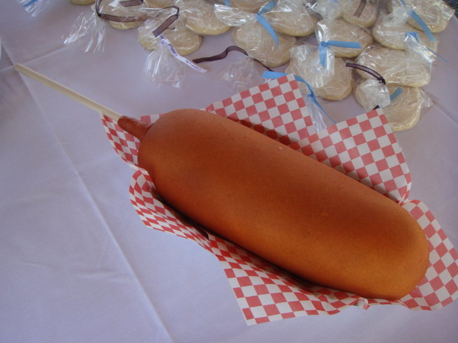 This was a grooms cake. He obviously loves corndogs! I airbrushed it first with orange then brown. TFL