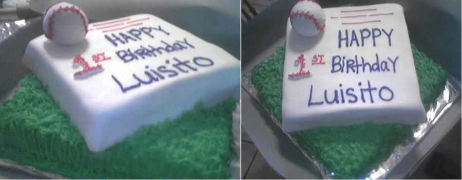 the bottom layer is decorated with buttercream to look like grass, the base is covered with mmf (my first attempt with mmf) and the baseball is also cake covered with mmf. There was supposed to be a glove, but it fell apart (i think i handled it too much)