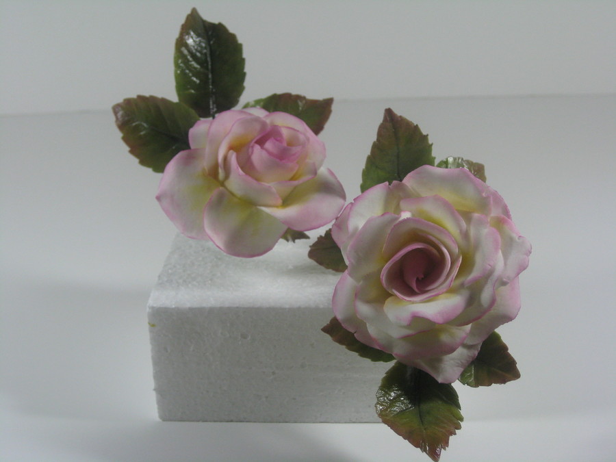 Gumpaste roses. I made the cutters for the leaves out of aluminum flashing and the two sided leaf veiner from silicone molds made of my own roses. Had to hurry to make the molds because the leaves will soon be gone for the season!