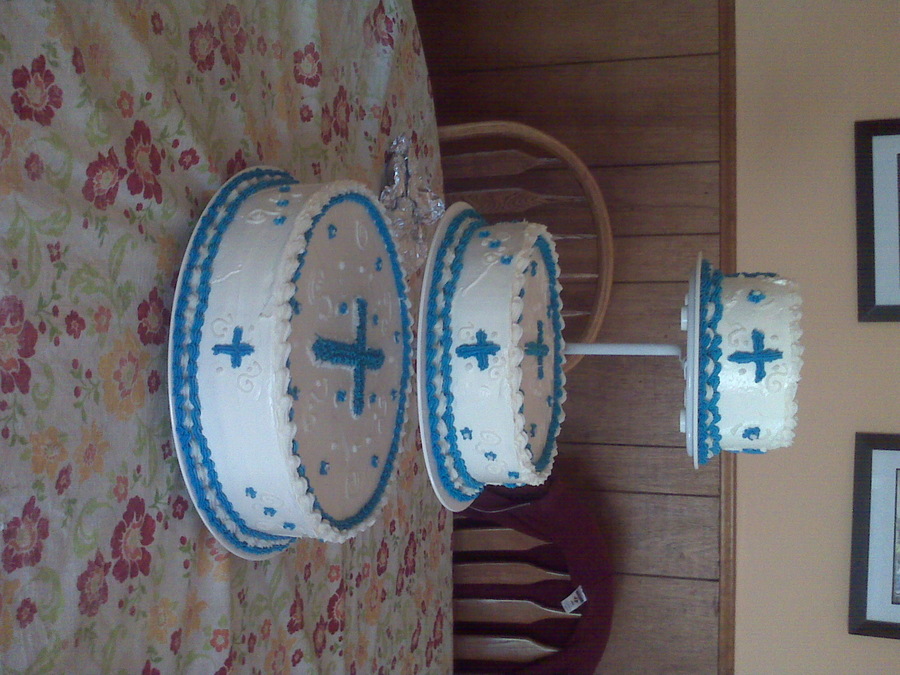 White cake, with strawberry cream cheese filing (saw the recepie on CC), italian buttercream, and crisco buttercream. Made for a baptism!