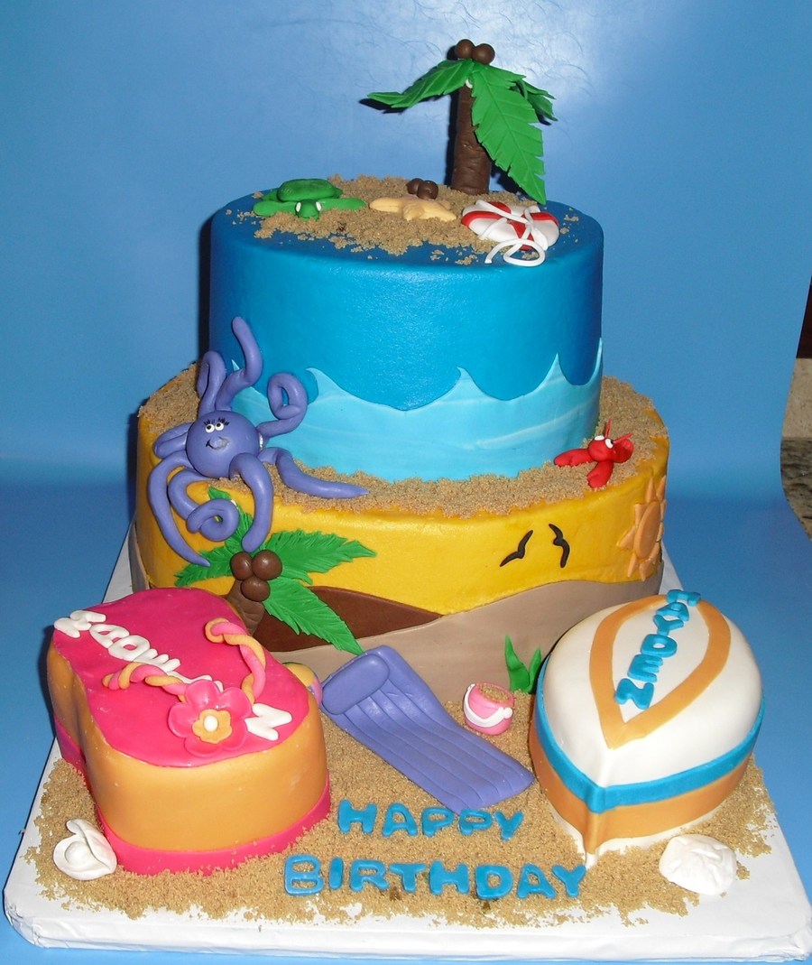 Brother and sister birthday swim party. All figures are fondant. Flip flop and surf are cake. White and chocolate cake with cookies and cream filling.